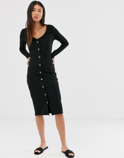 Gold Button Ribbed Midi Dress With Long Sleeves Black Styledup Co Uk